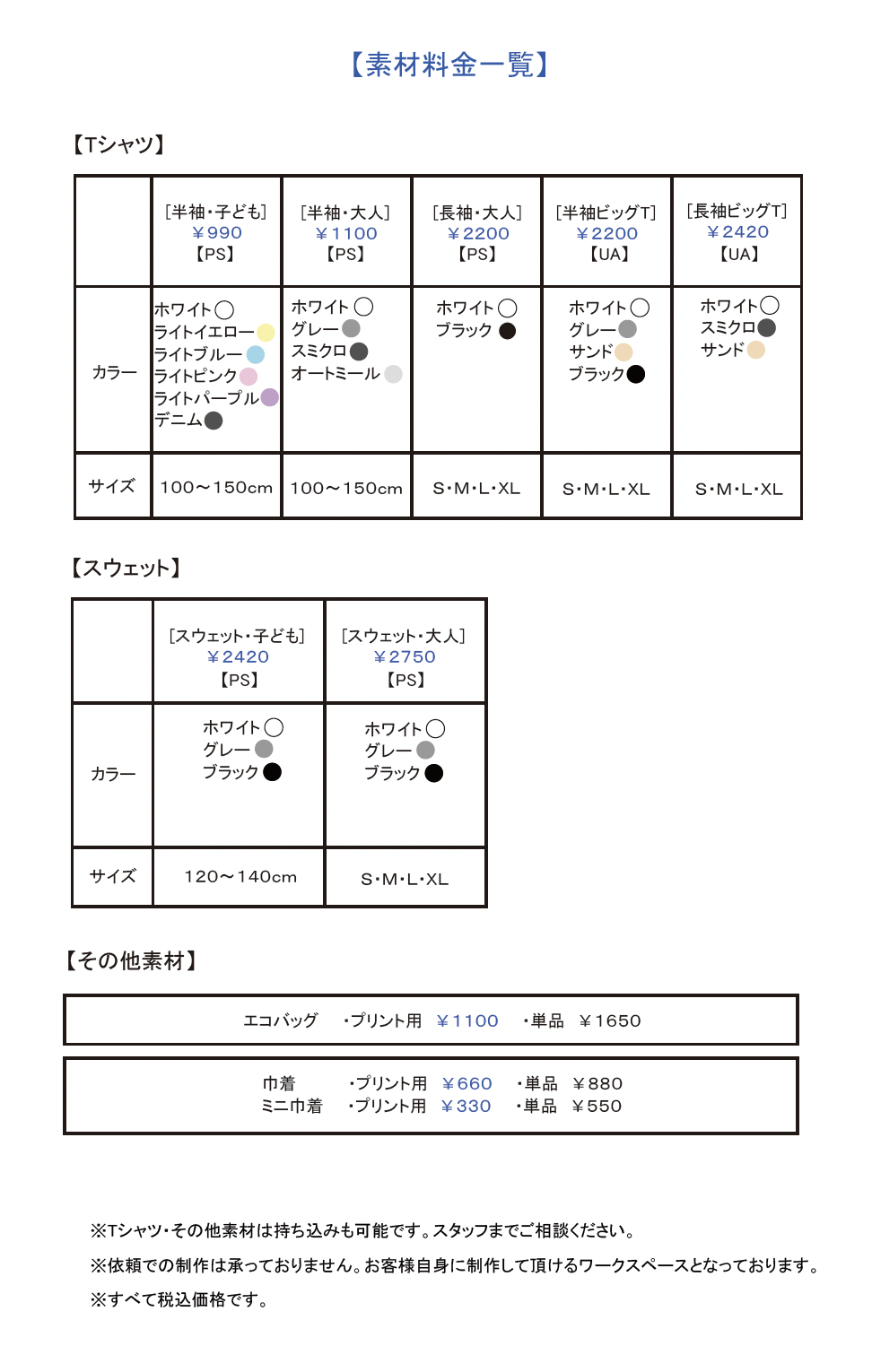 [利用料]+[製版料金]+[インク代]+[Tシャツ代(お持込の場合は不要)]の合計にて承ってお ります。